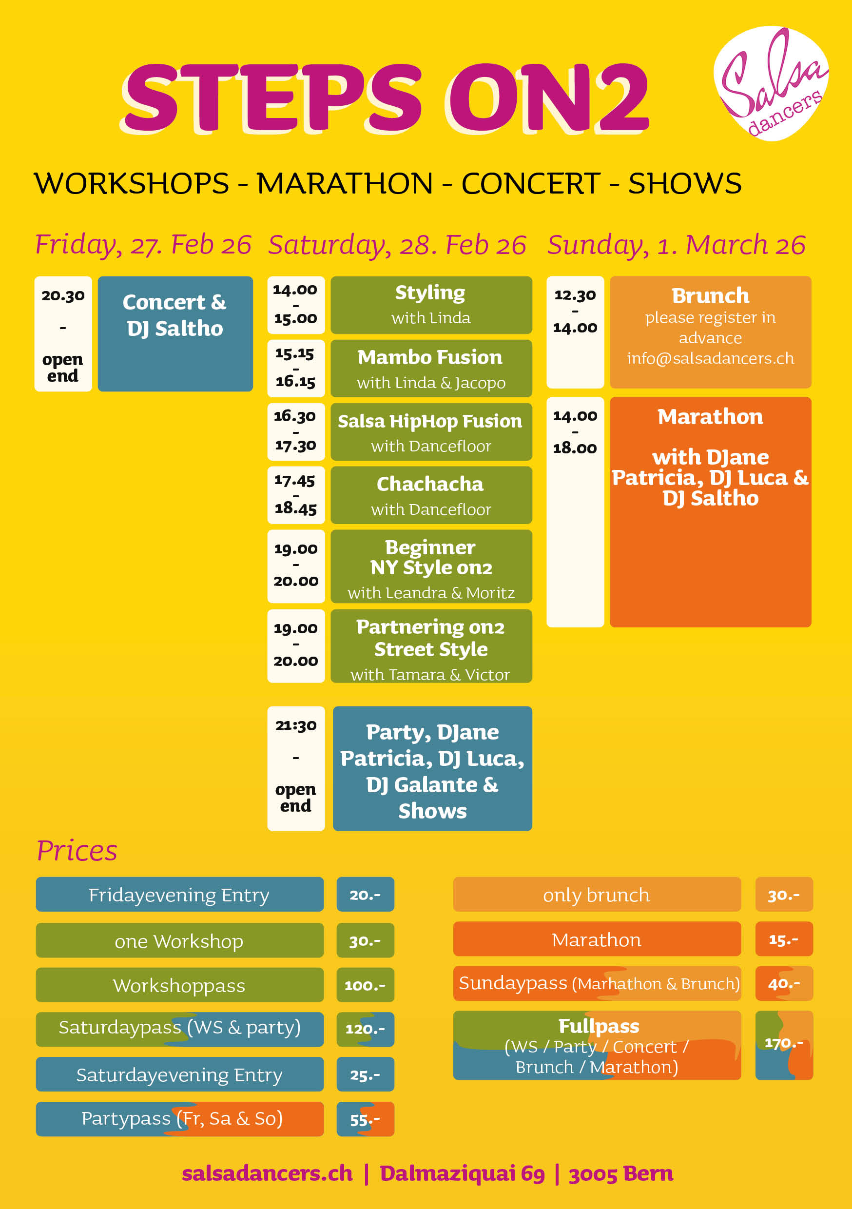 Samstag – Workshops & Party Lerne und wachse! Am Samstag erwarten dich inspirierende und schweisstreibende Workshops, voller Energie und Lehrpersonen, die dich motivieren. Am Abend heisst es dann: Partytime! Eine Salsa-Party mit spektakulären Shows, fantastischen DJ’s und einer Stimmung, die dich tragen wird, bis die Lichter ausgehen.